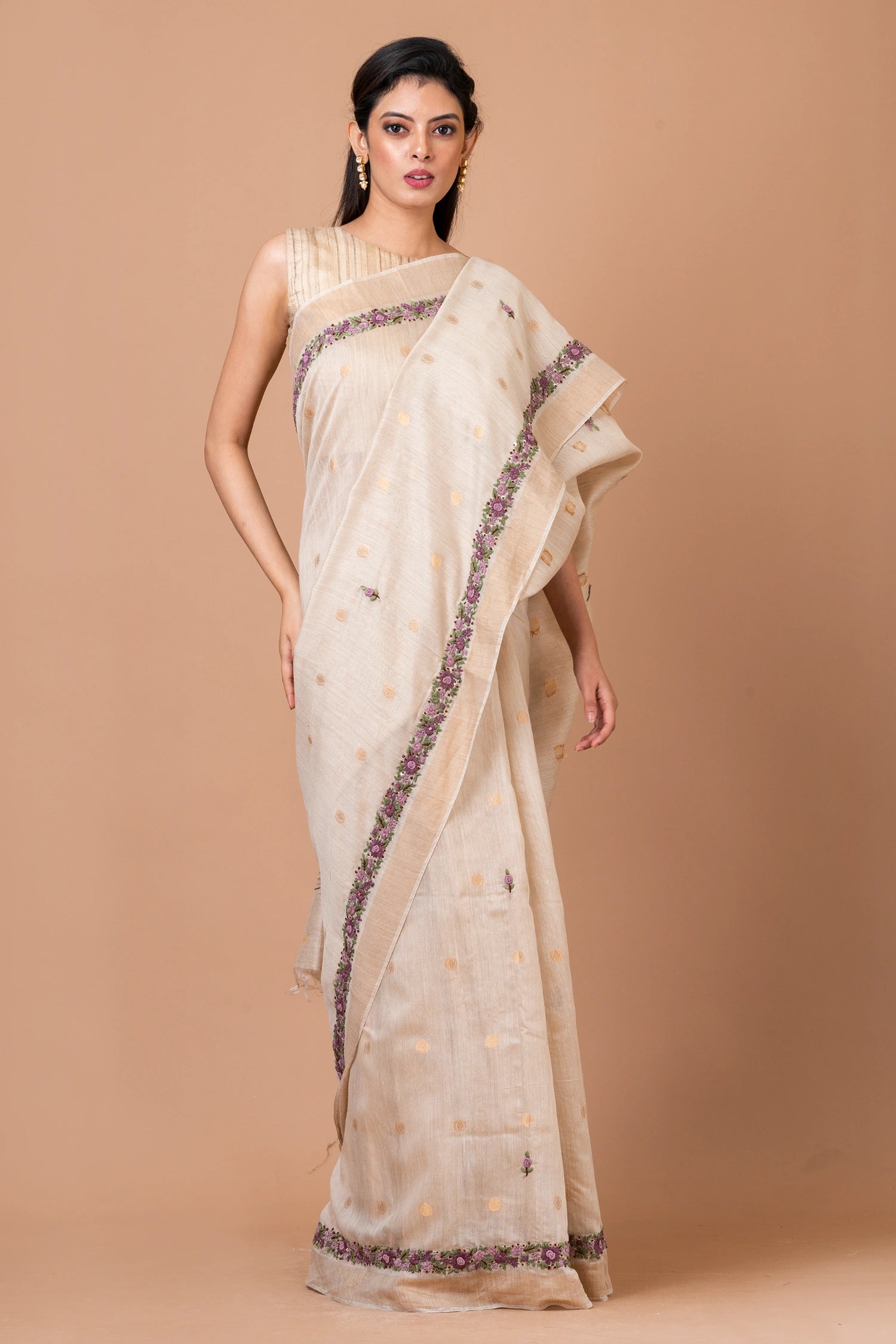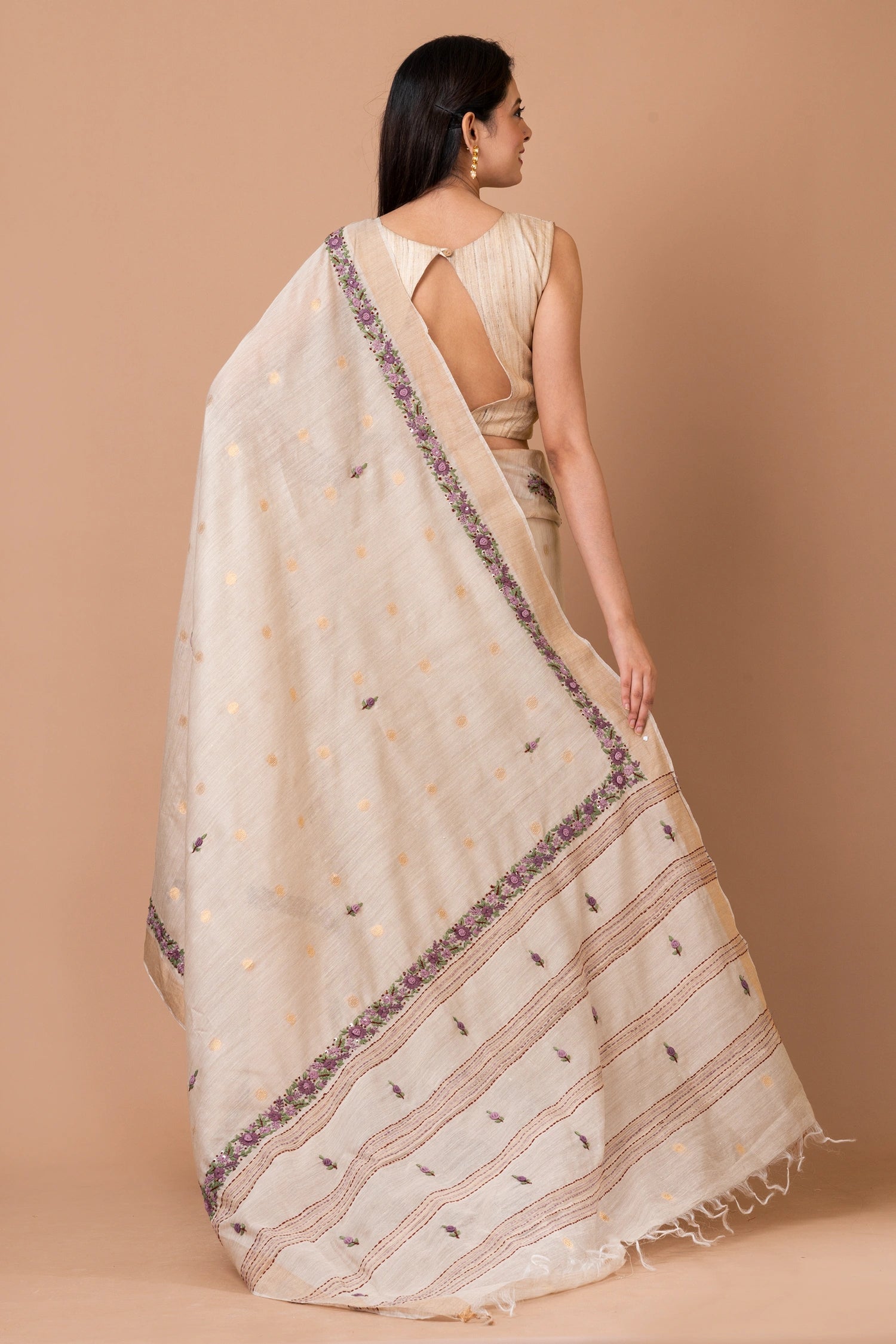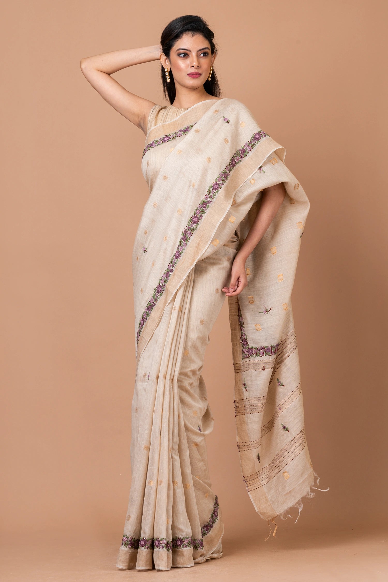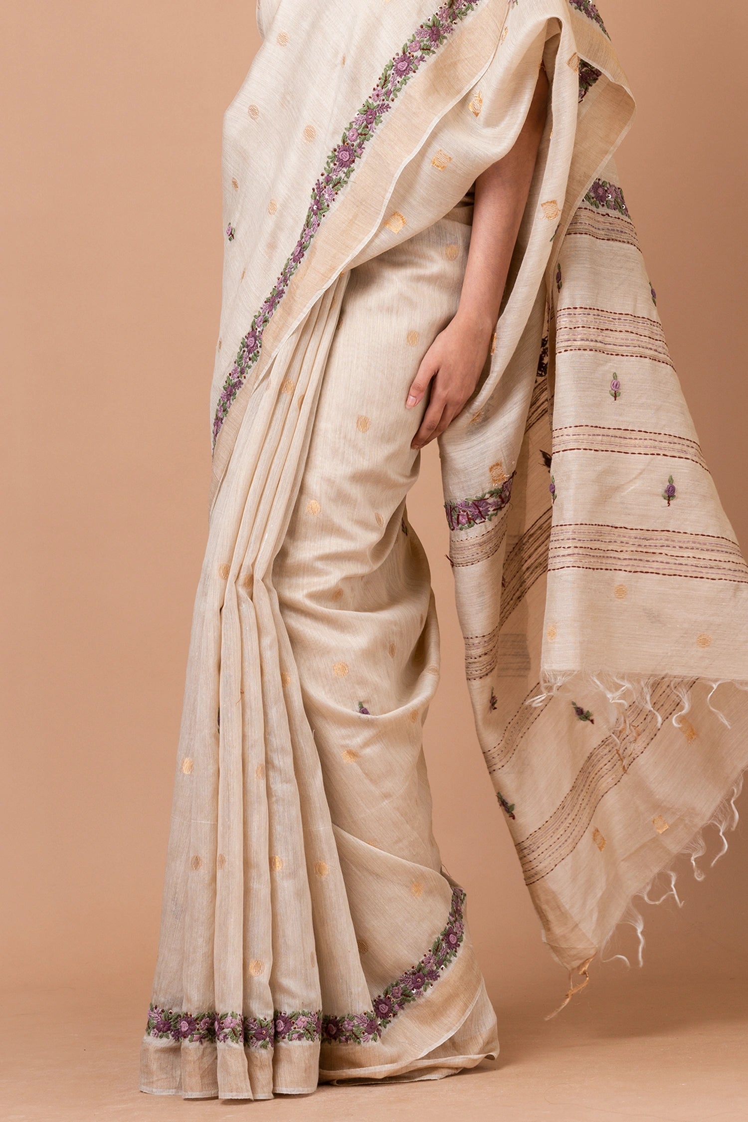 Fabric: Linen Silk Zari Buta Border Woven Saree