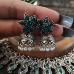 Set with an emerald colored stone, silver, antique finish, and a round neck-piece with a drop jhumka earring. The neck-piece is adorned with intricate motifs and a traditional style that runs along your delicate neck. Make a statement with this piece by pairing it with a garment.
