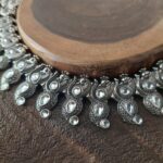 Set with white colored stone, silver, antique finish, and a round neck-piece with a drop jhumka earring. The neck-piece is adorned with intricate motifs and a traditional style that runs along your delicate neck. Make a statement with this piece by pairing it with a garment.