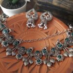 Set with emerald colored stone, silver, antique finish, and a round neck-piece with a drop jhumka earring. The neck-piece is adorned with intricate motifs and a traditional style that runs along your delicate neck. Make a statement with this piece by pairing it with a garment.