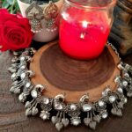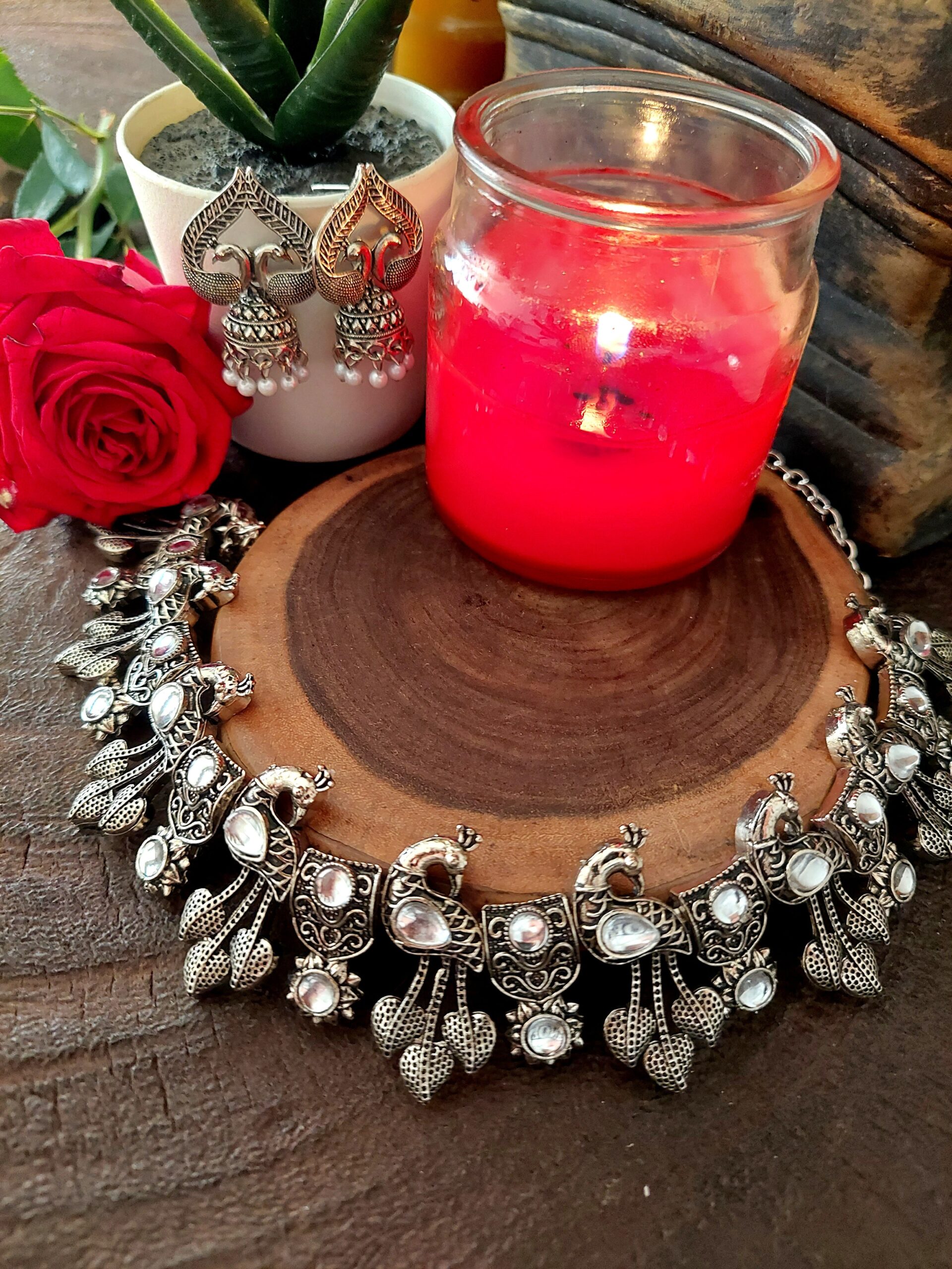 Peacock set in white colored stone with a silver antique finish combined with a circle neck-piece and a drop jhumka earring. The neck-piece is adorned with intricate motifs and a traditional style that runs along your delicate neck. Make a statement with this piece by pairing it with a garment.