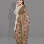 The duppatta is covered in Traditional digital Kilim prints, which are accentuated by a wide detailed Kilim motif printed border. Its design value is enhanced by the Duppatta being done with an earthy toned base embellished with Rich pastel colored Kilim motifs being highlighted. Detailed, Jaal like Kilim motifs adorn throughout the body of the Duppatta. The Kilim prints have been modernized in response to changing fashion trends. The piece can be styled in a traditional way adding value to the richness of the art and tradition with an Elaborate, detailed, Intricate motifs. It’s one-of-a-kind piece that combines tradition and style.