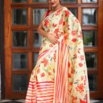 Vibrant fluid watercolor floral all over light cream color base designed in water colored pattern & lines accentuates its style. The bright floral prints, with the stripe in the border makes a frame around the prints bringing it into focus, and giving this piece a unique vibrancy and beauty.