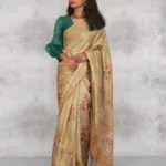 The Tussar silk saree falls softly and beautifully over feminine curves. Because of the tussar fabric, the saree has a soft vintage appearance. The entire torso is covered in digitally printed abstract geometrical motifs. The saree is defined by soft earthy tones, and traditional kalamkari motifs adorn the saree’s borders, highlighting the craftsmanship and beauty. The border motifs on the saree are done in contrasting tones. Drape this one-of-a-kind garment around your curves and flaunt it proudly to bring out the strong, regal charm and grace of your feminine beauty.