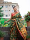Kalamkari jaal all over the body with a regal Peacock pallu in rich Tussar silk, the saree represents our tradition and royalty. The detailed motifs proves the authenticity of the art and it’s rich heritage and cultural value. Light, comfortable drapes of the saree, make it easy and stress free to wear and flaunt elegantly.