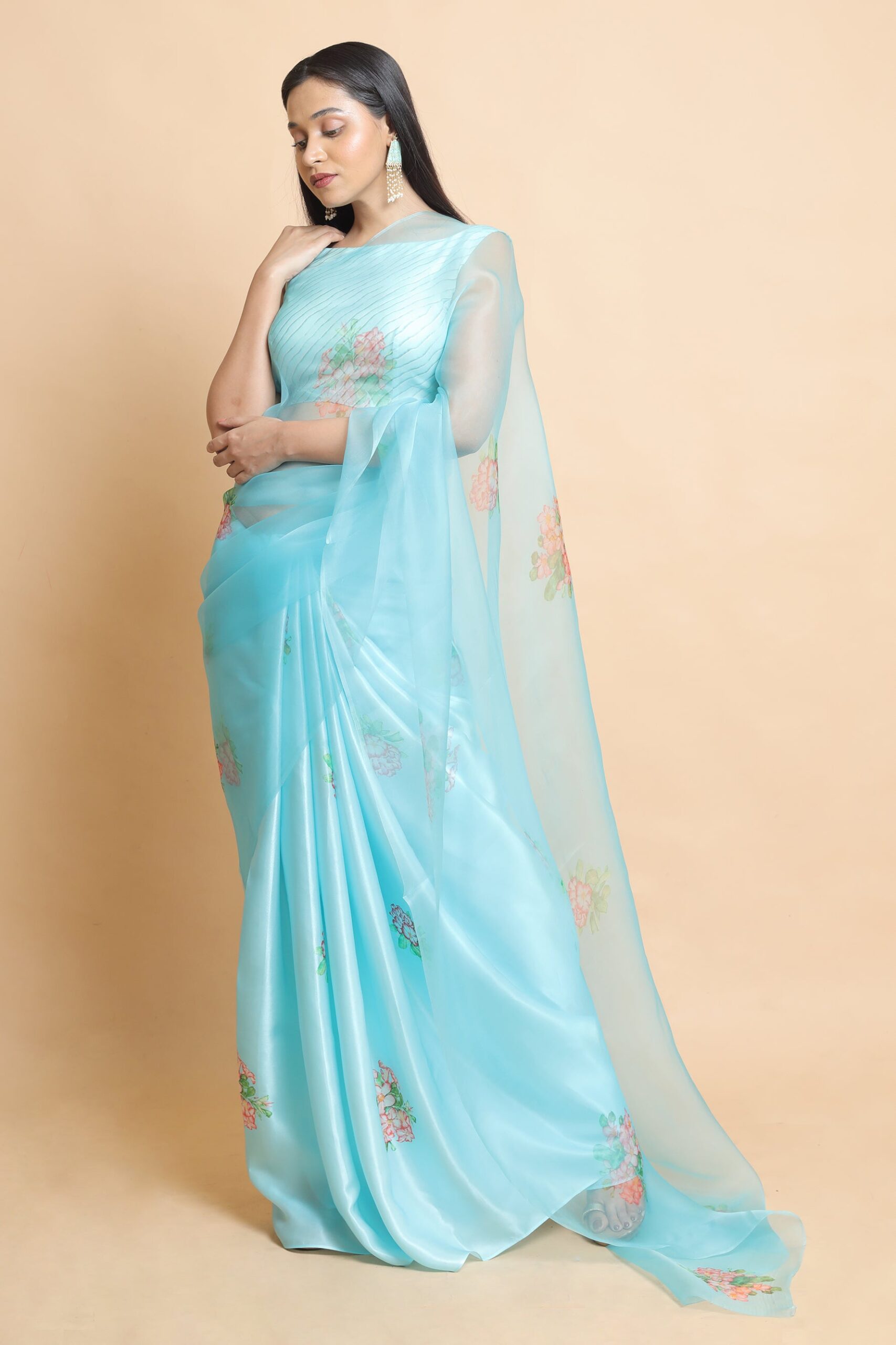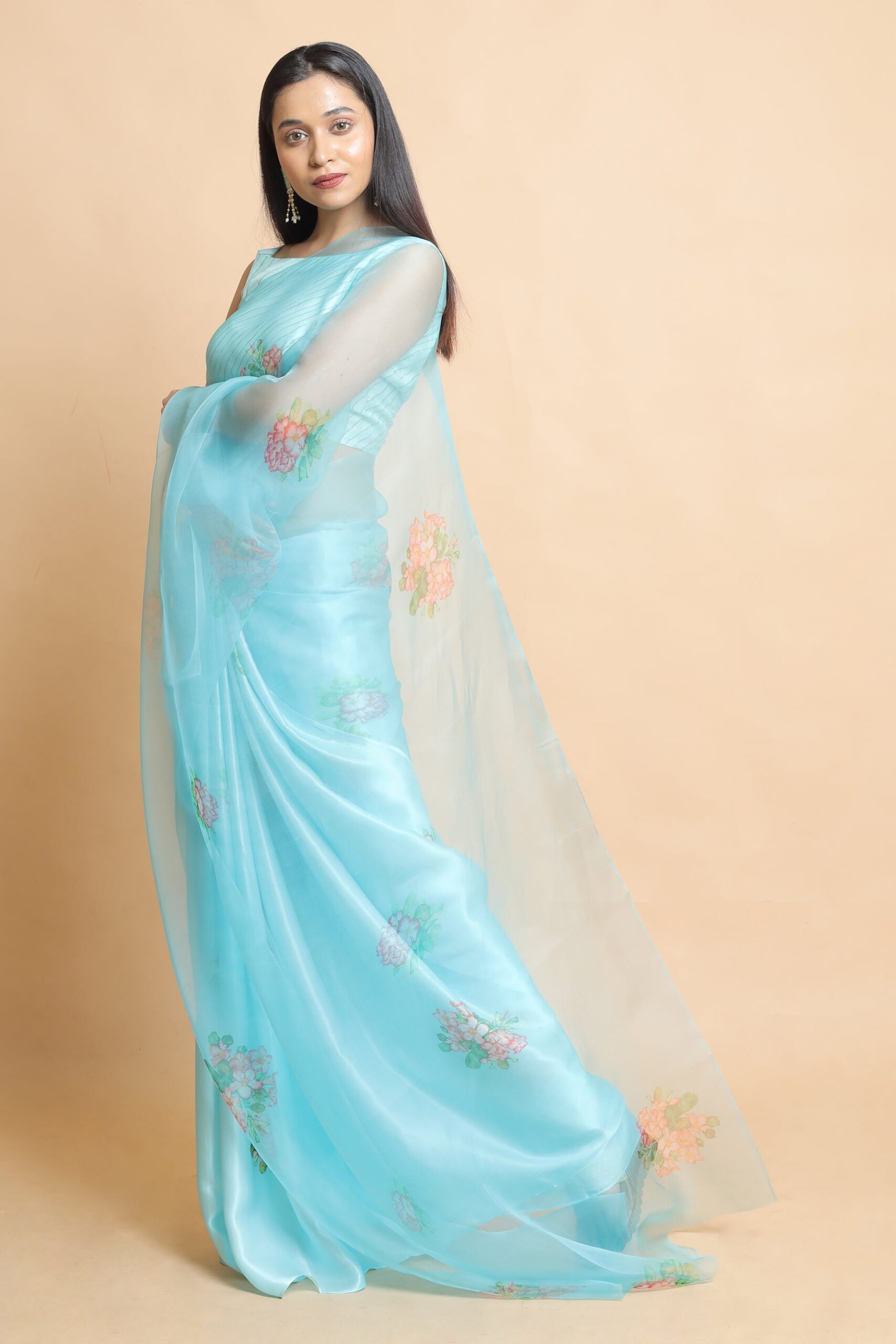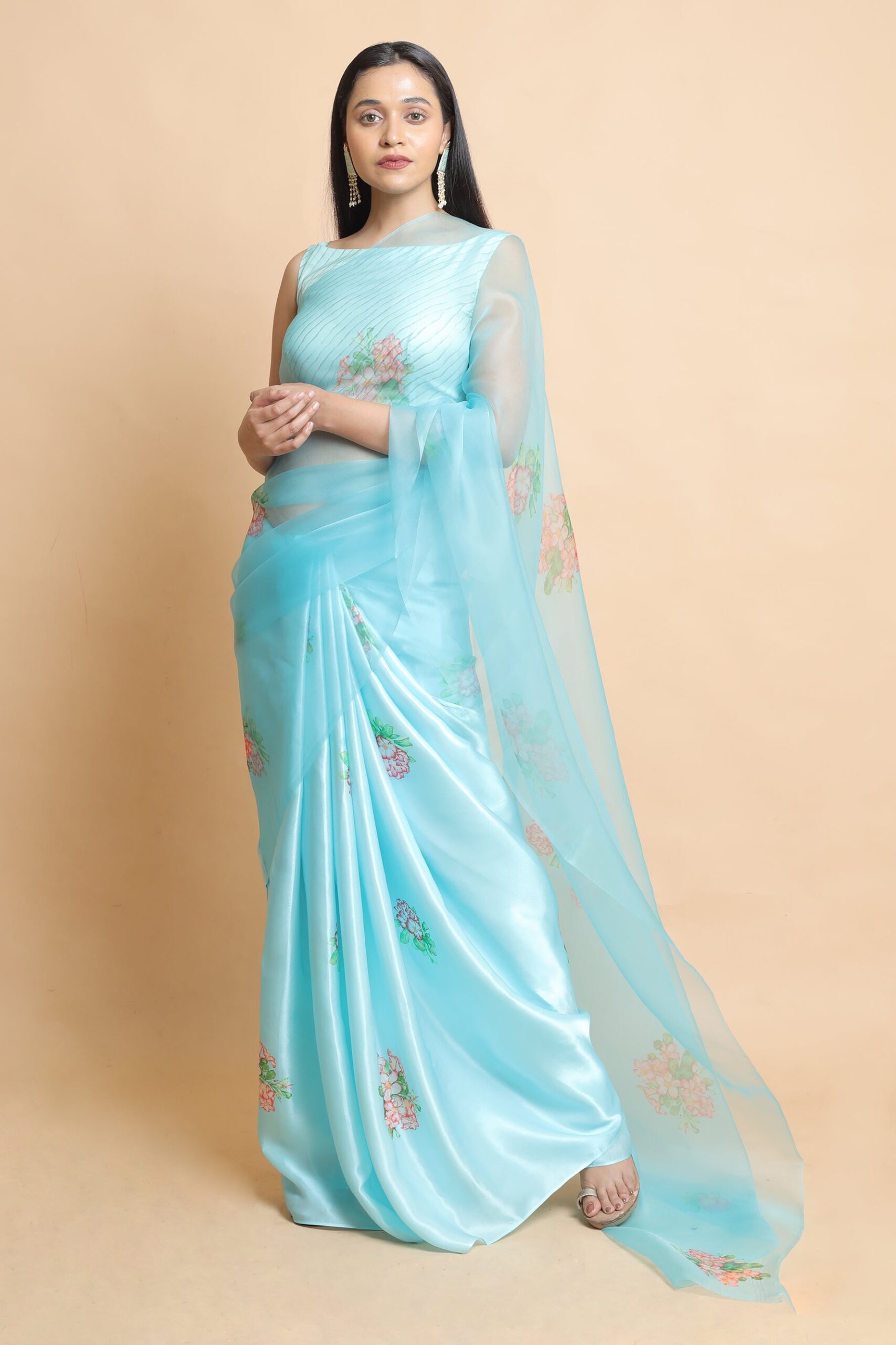 A half-and-half sari is created by joinery of two materials, organza silk and satin crepe, to create a sari that drapes and glides lightly over the body, emphasizing feminine curves and attractiveness. The pallu has a gorgeous sheer appearance and is weightless, providing a fine and sensitive hand-feel, making this saree not only beautifully beautiful but also as light as a feather to drape. The saree's body is comprised of a satin crepe blend that has a faint shimmer and serves as a focal point. The saree is completely covered with hand-painted flower digital designs. With a gorgeous pastel blue base and soft colourful blossoms all throughout, this pattern is feminine and one-of-a-kind. A statement of femininity and sophistication.