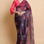 The half and half sari is made by the joinery of two textiles: organza silk and satin crepe, which drapes and falls smoothly around the body, emphasizing feminine curves and beauty. Pallu has a beautiful sheer look and is weightless giving a fine and soft hand-feel, making this saree not only elegantly beautiful but just like a feather to drape . The saree’s body is done with a satin crepe blend, giving a subtle shine, making it a center of attraction. Beautiful Vibrant hand painted floral prints decorate the whole saree. The design is bold and one-of-a-kind, with a dark bold base and vibrant floral motifs. The whole piece brings out the sheer, transparent, boldness within you.
