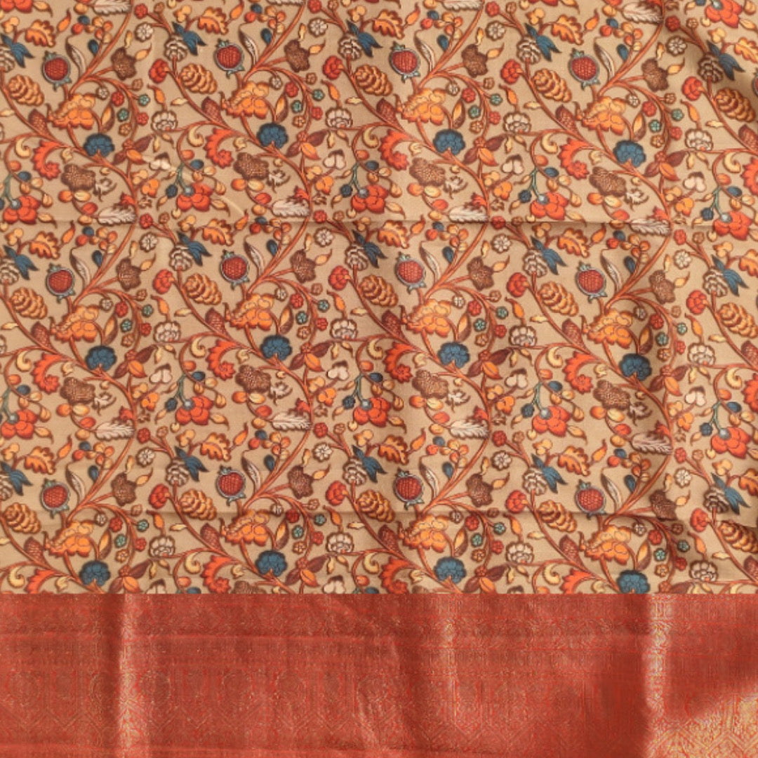 This beige coloured kanjivaram saree with multicoloured motifs brings the essence of crafts through digital printing.
