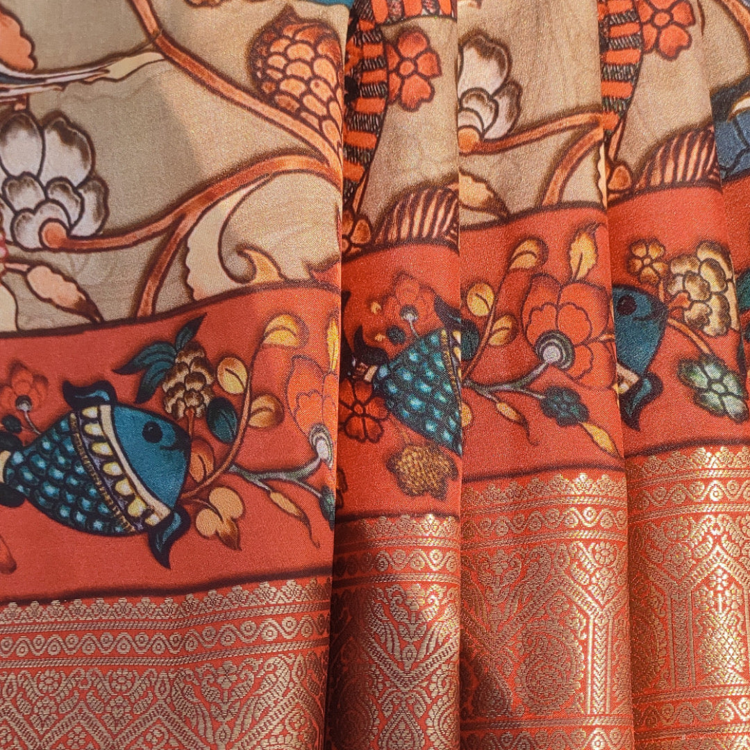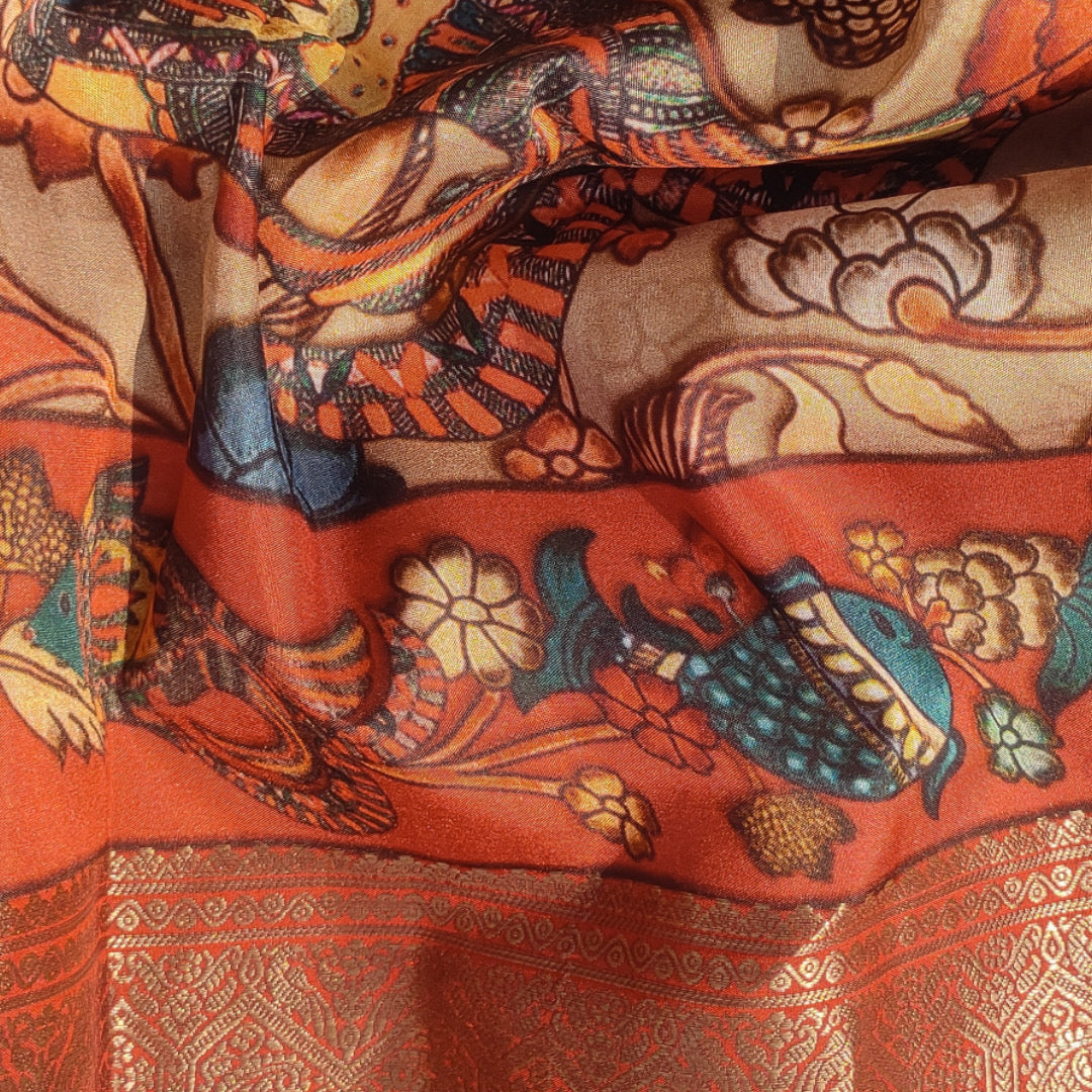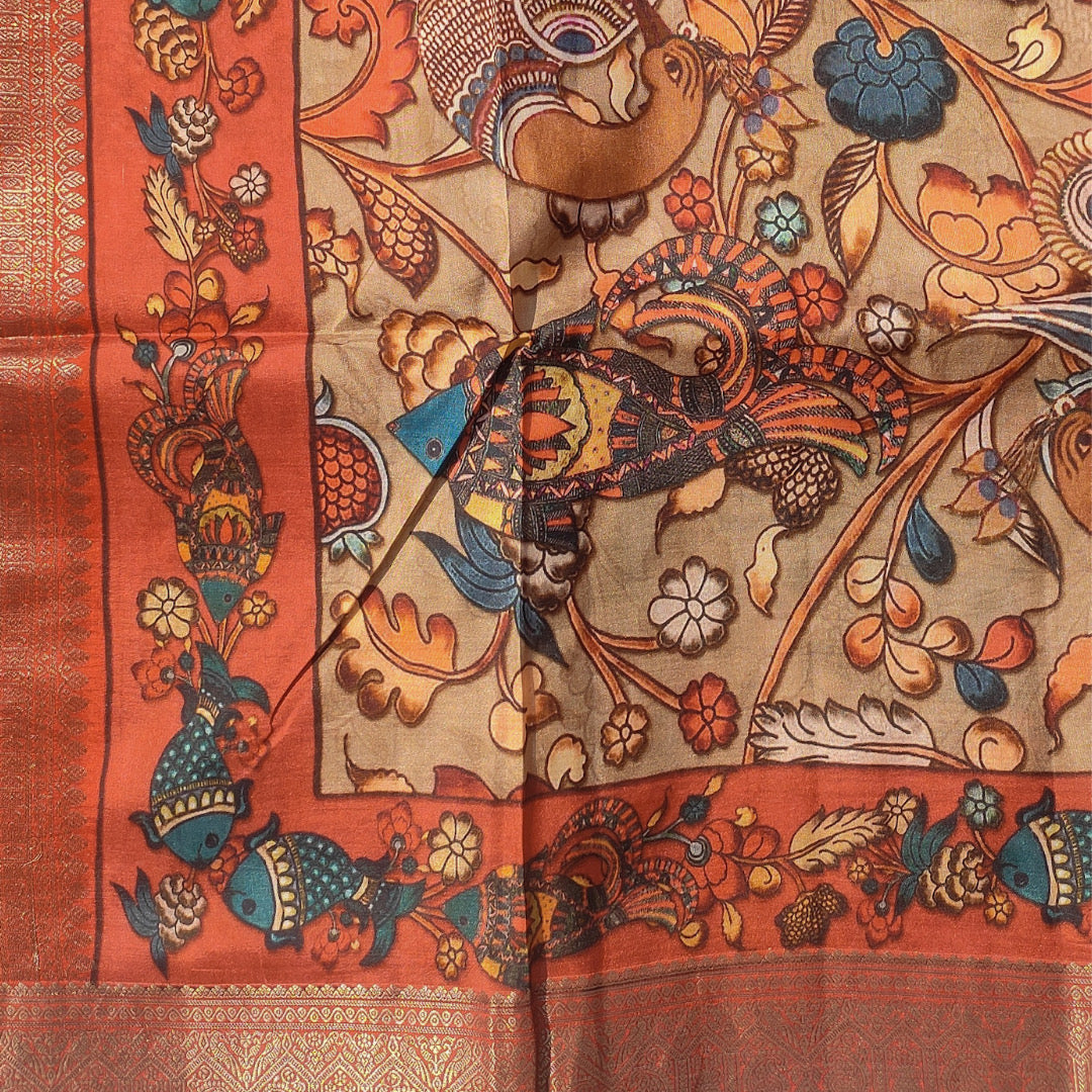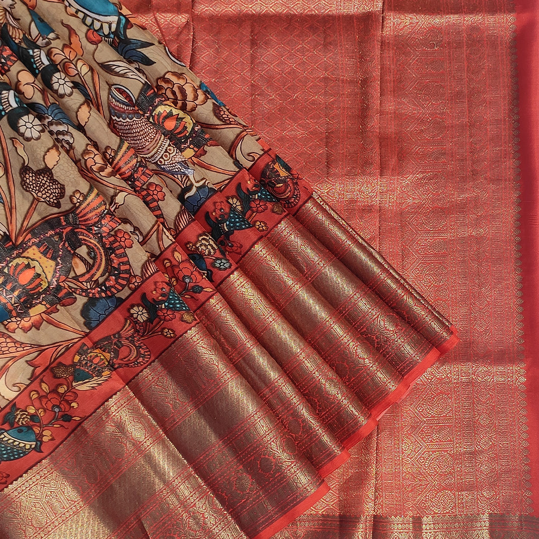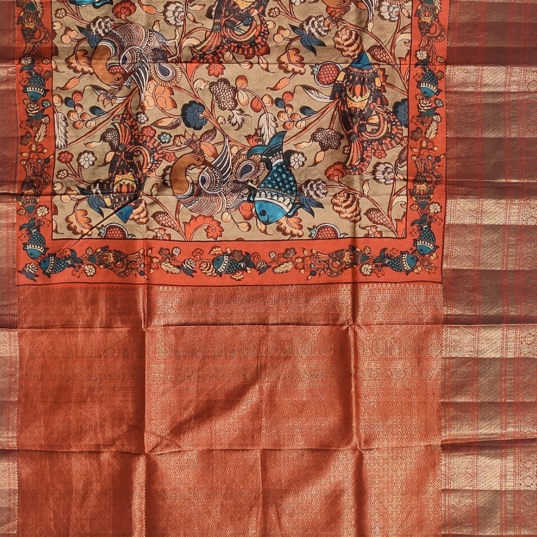 Kanjivaram saree with artworks of kalamkari printed on all over the body. The saree has rich woven zari pallu and heavy zari woven border.