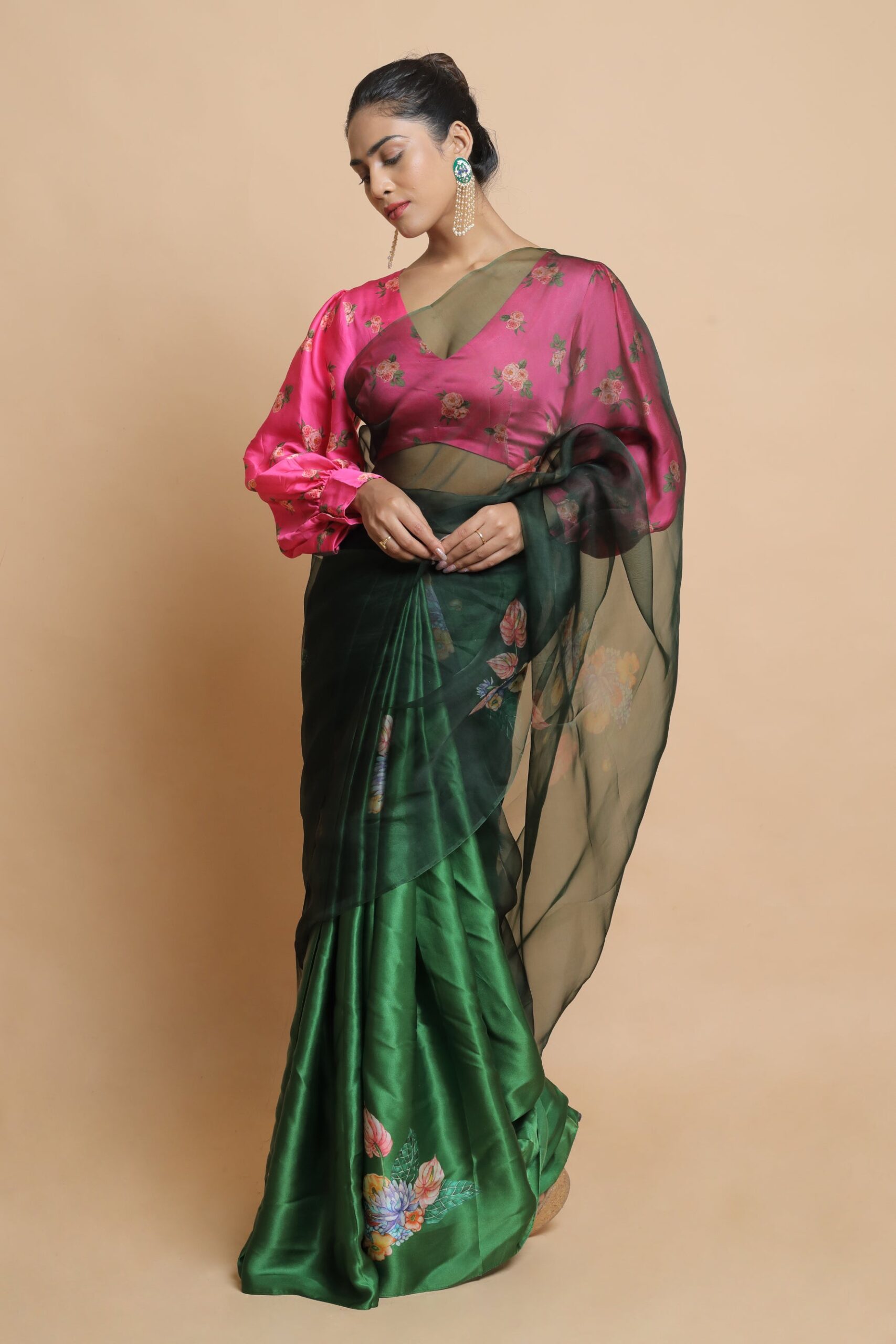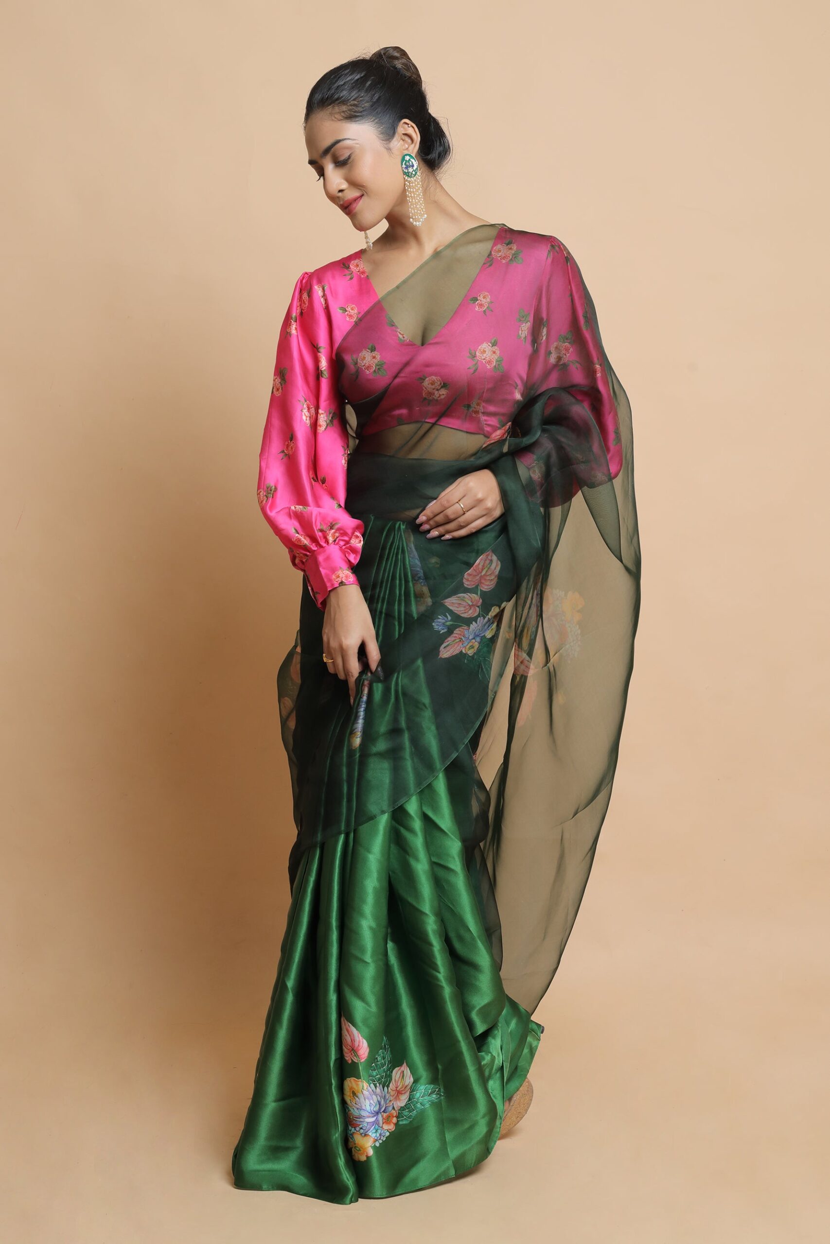 The joinery of two textiles, organza silk and satin crepe, creates a half-and-half sari that drapes and glides gently over the body, highlighting feminine curves and beauty. The pallu has a lovely sheer appearance and is weightless, giving a fine and smooth hand-feel, making this saree not only beautifully stunning but also as light as a feather to drape. The saree’s body is made of a satin crepe blend, which gives it a subtle sheen and makes it a focal point. The entire saree is decorated with vibrant hand painted floral designs. With a dark bold foundation and colourful floral embellishments, the design is striking and one-of-a-kind. The entire piece brings out your pure, transparent, bravery.