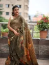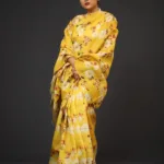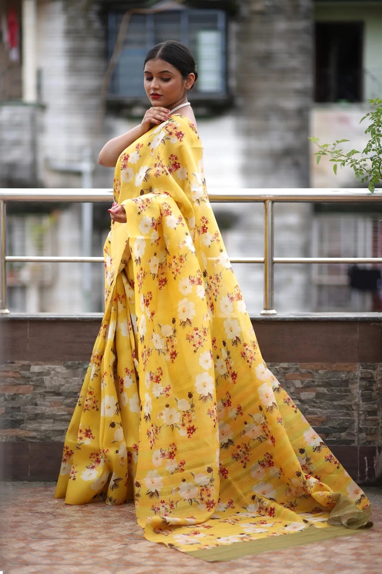 Yellow base coloured organza saree with floral print all over the body. The bright yellow