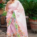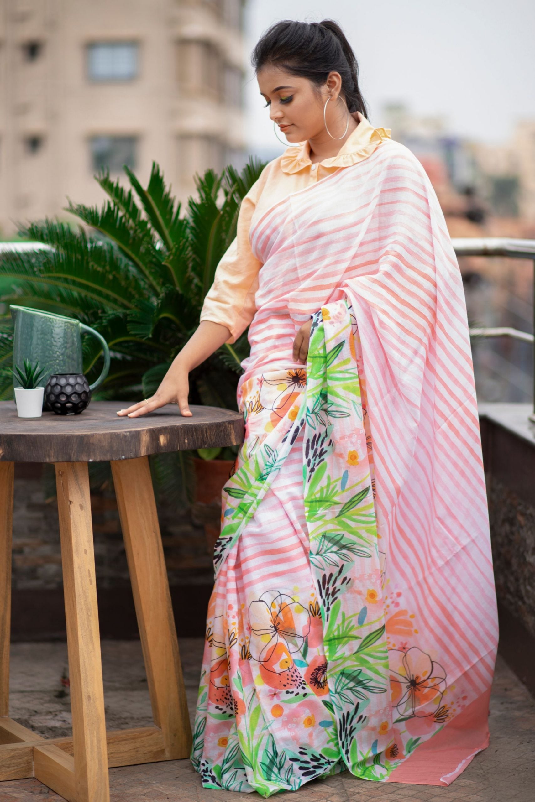 Vibrant, colorful water color stripes all over the body with tropical floral border on natural mulmul is one of the favorites being subtle, feminine and soft to touch and drape. The soothing, natural yet vibrant colors make it stand out in the crowd.