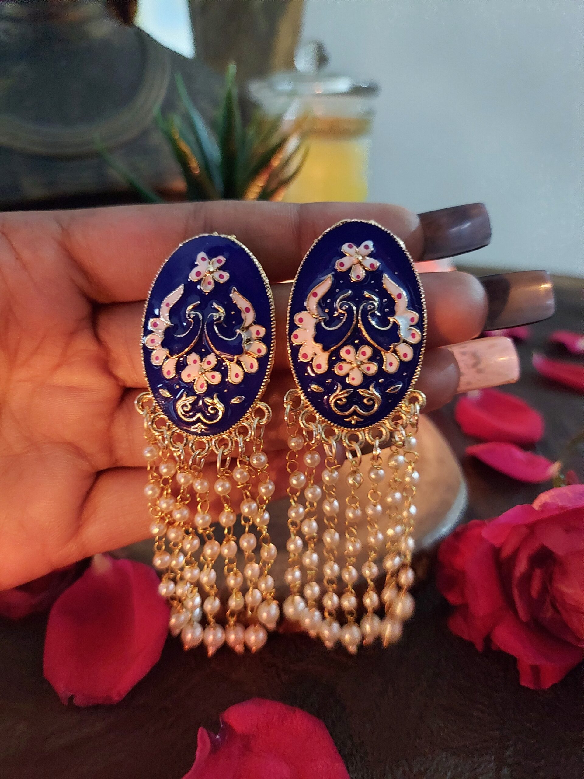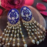 Royal blue color raindrop earring, with gold finish and intricate details. Complimented with hanging raindrop white beads. Pair it with any outfit of your choice and bring out the elegance of this jewel.