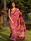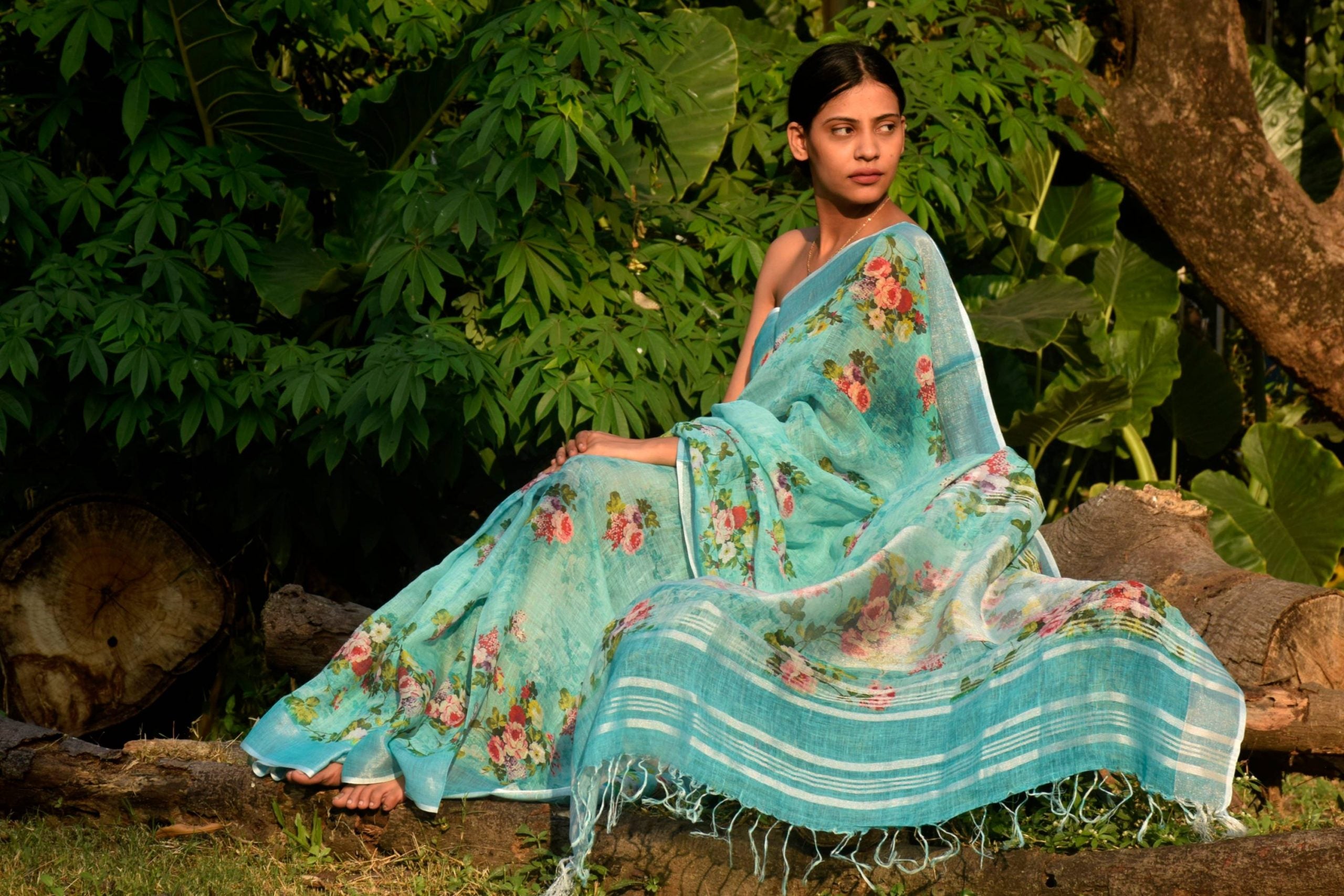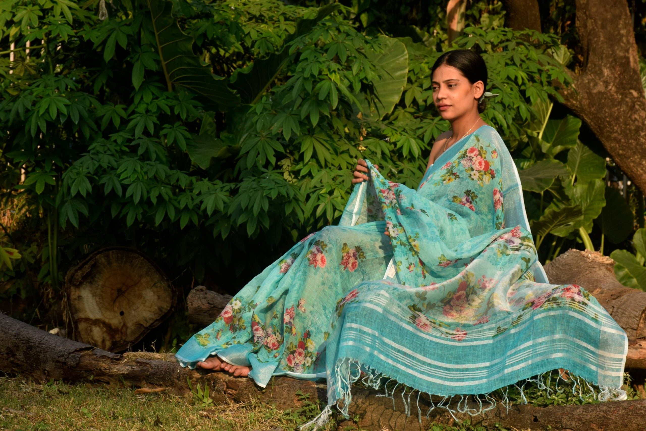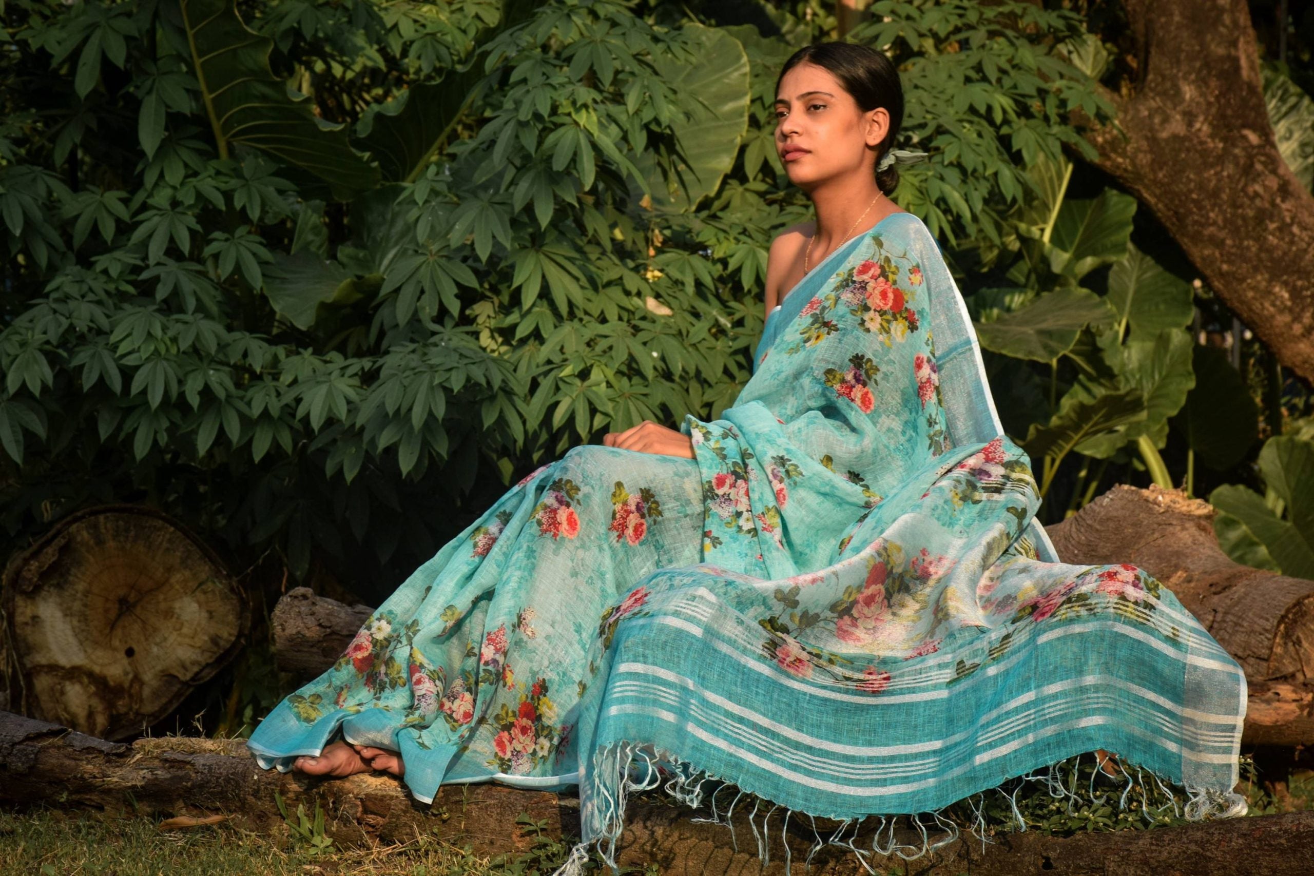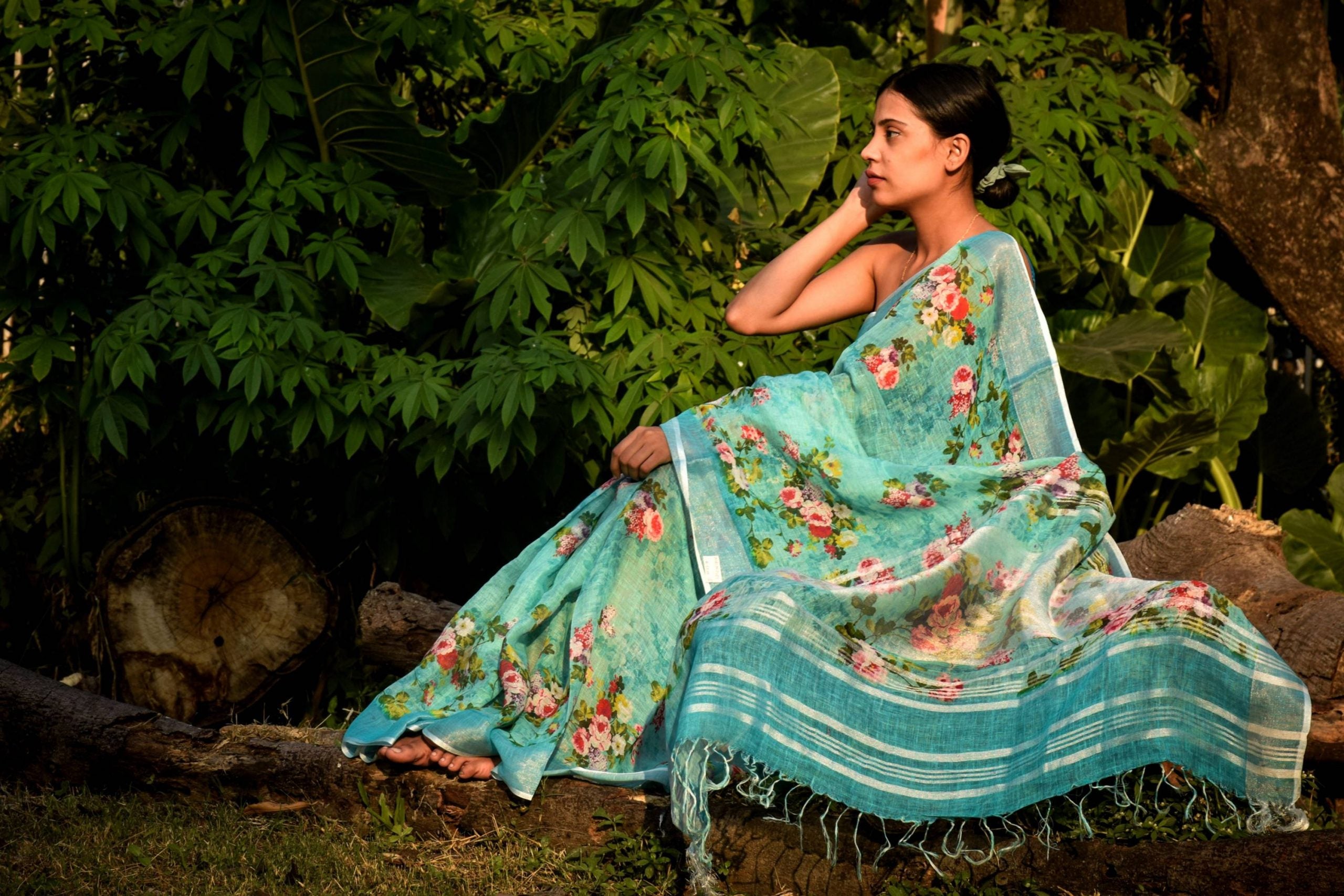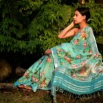All over colorful floral prints on Linen saree embellished with zari border, creating a classic piece to be adorned with beauty and perfection.