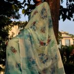 Colorful floral prints cover the entire linen saree, which is embellished with a zari border, creating a timeless piece to be adorned with beauty and perfection. The soft fall of the saree makes it easier and comfortable to wear and carry. The subtle beauty of the saree enriches the wearer’s natural look and compliments her features.