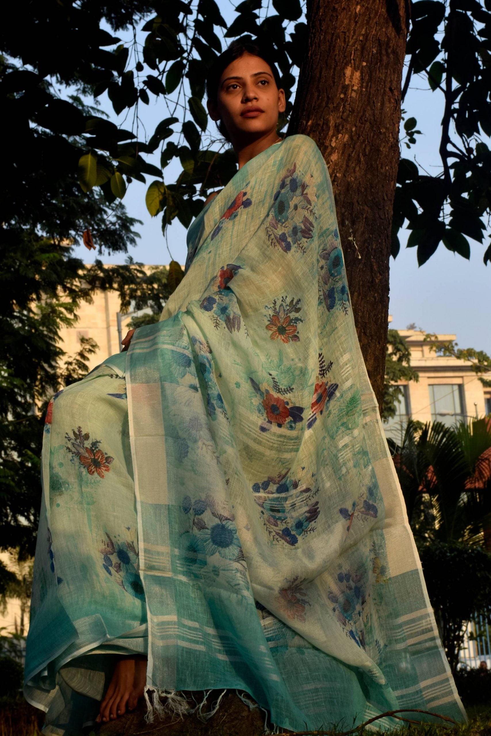 Colorful floral prints cover the entire linen saree, which is embellished with a zari border, creating a timeless piece to be adorned with beauty and perfection. The soft fall of the saree makes it easier and comfortable to wear and carry. The subtle beauty of the saree enriches the wearer's natural look and compliments her features.