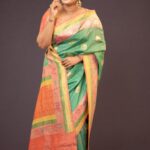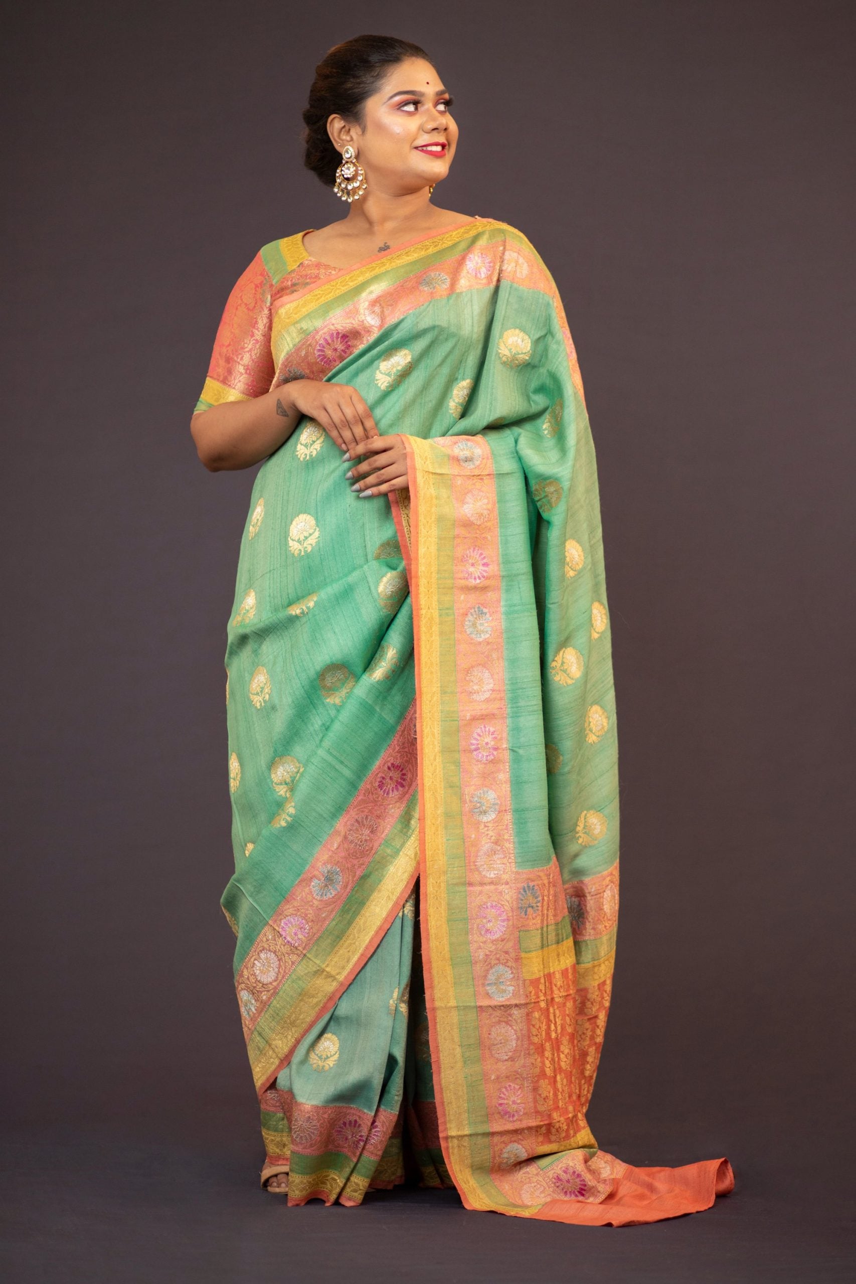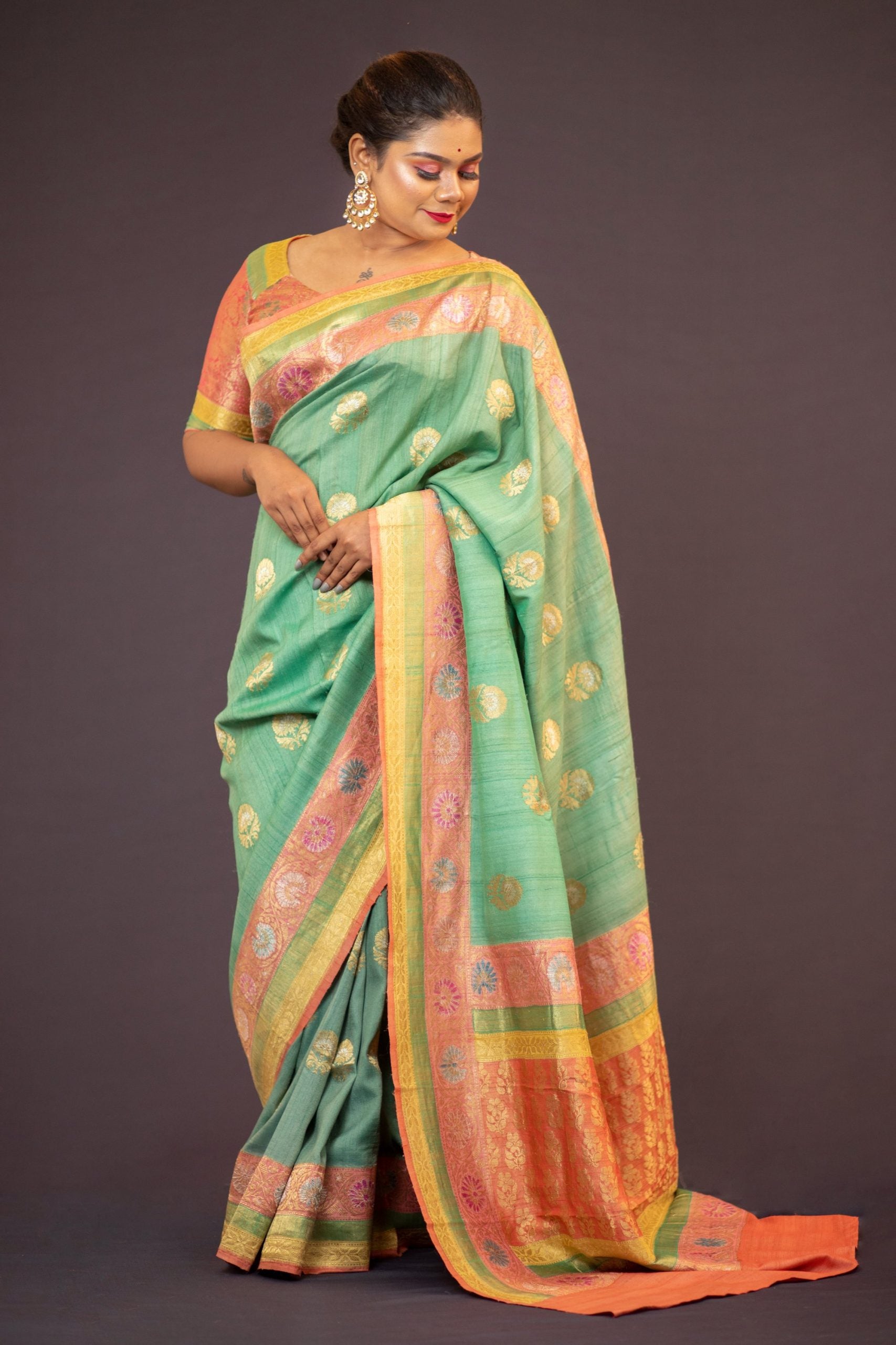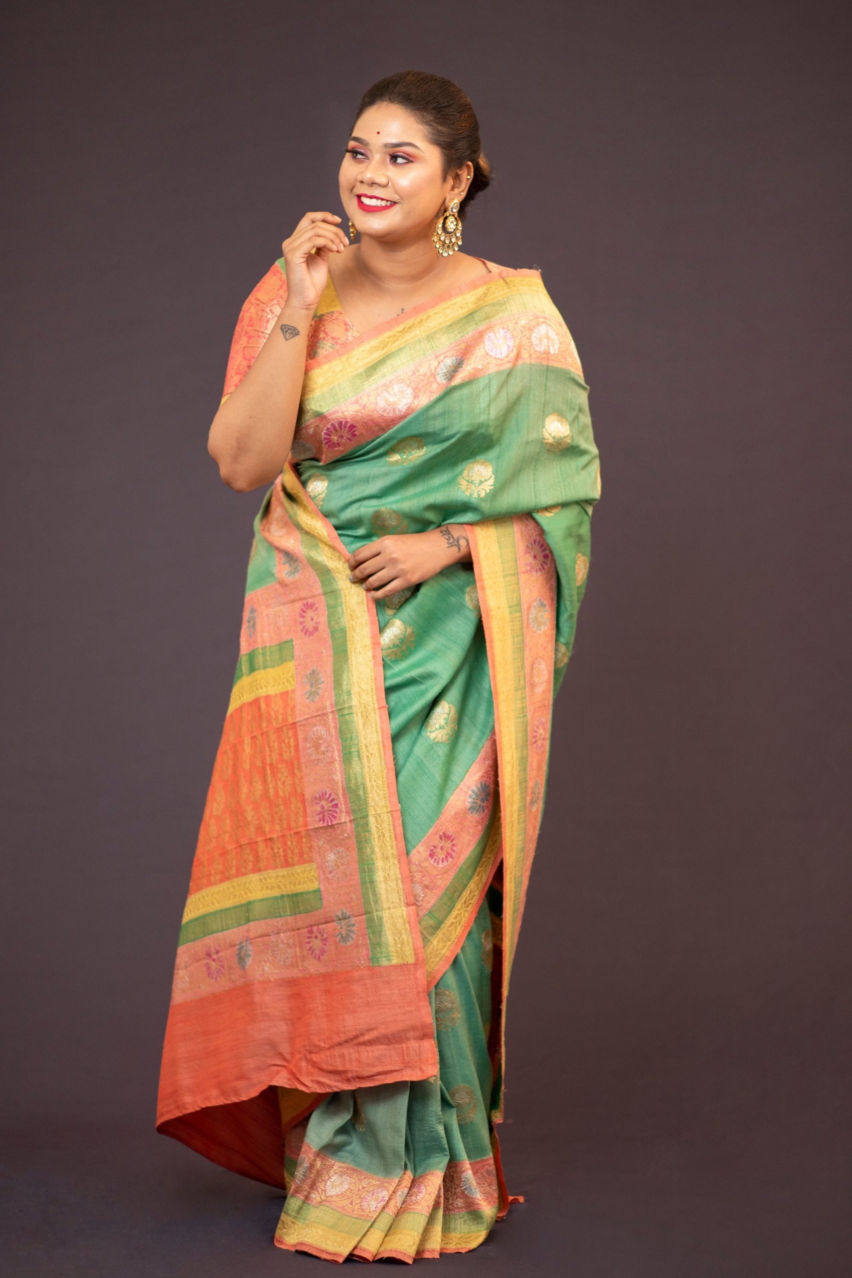 Eclectic traditional hand woven banarasi weaved with meenakari zari work on Tussar Gheecha saree. The richly embellished saree, gives a sense of royalty, richness, heritage and beauty. Detailed pallu design and zari motifs all over the body and border highlights and accentuates the craft’s rich heritage and authenticity.