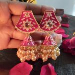 Traditional, stylish fushia colored jhumka, with white drop beads. Pair it with any kind of Indian outfit of your choice and bring out the delicacy, and beauty of this jewel.
