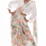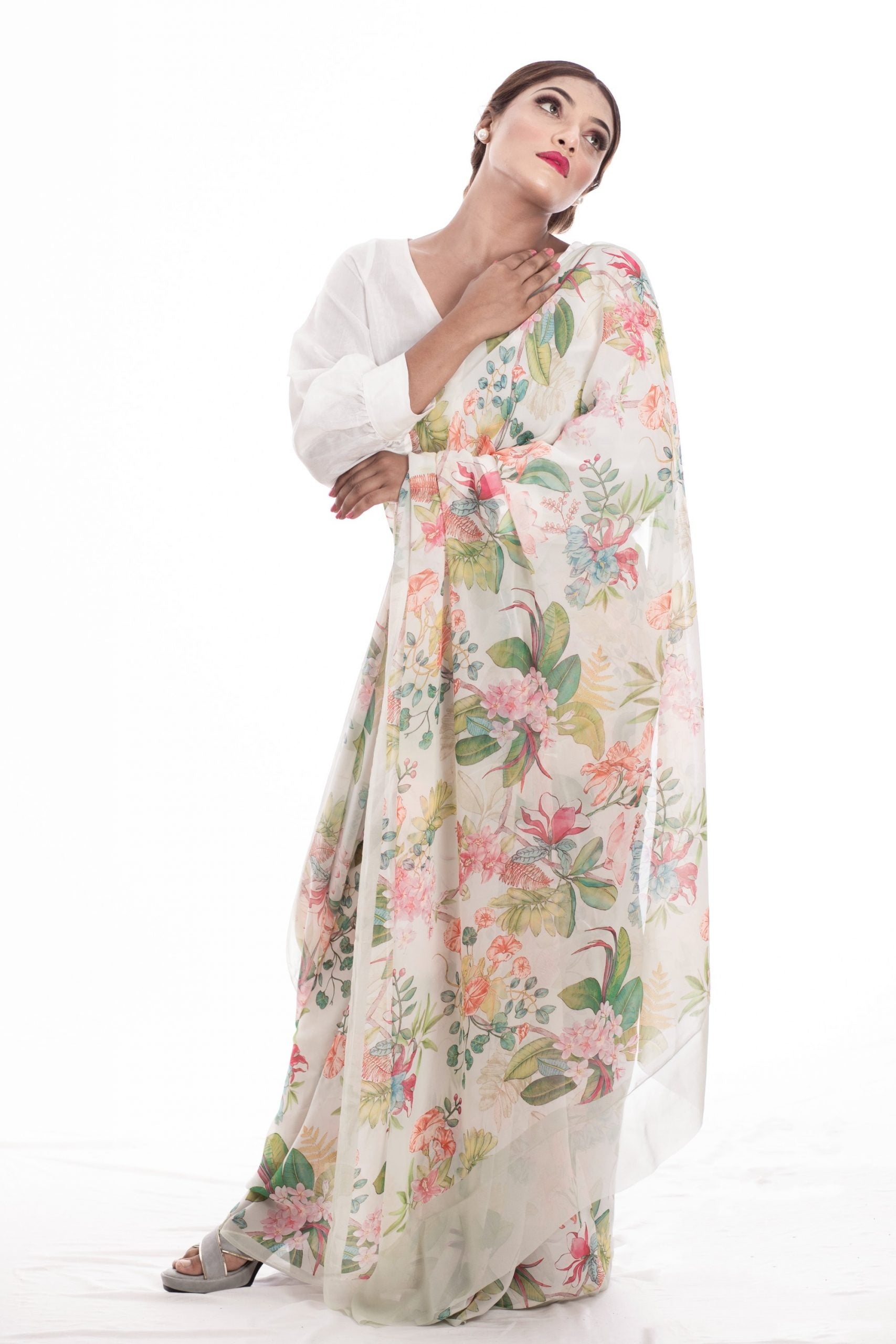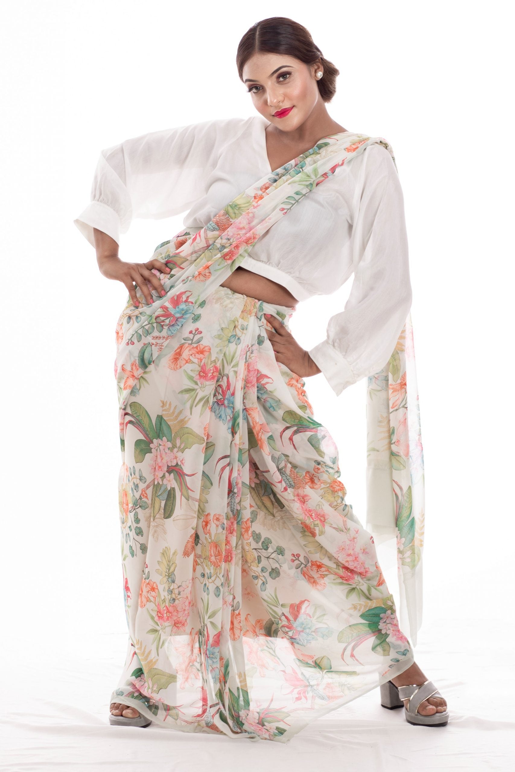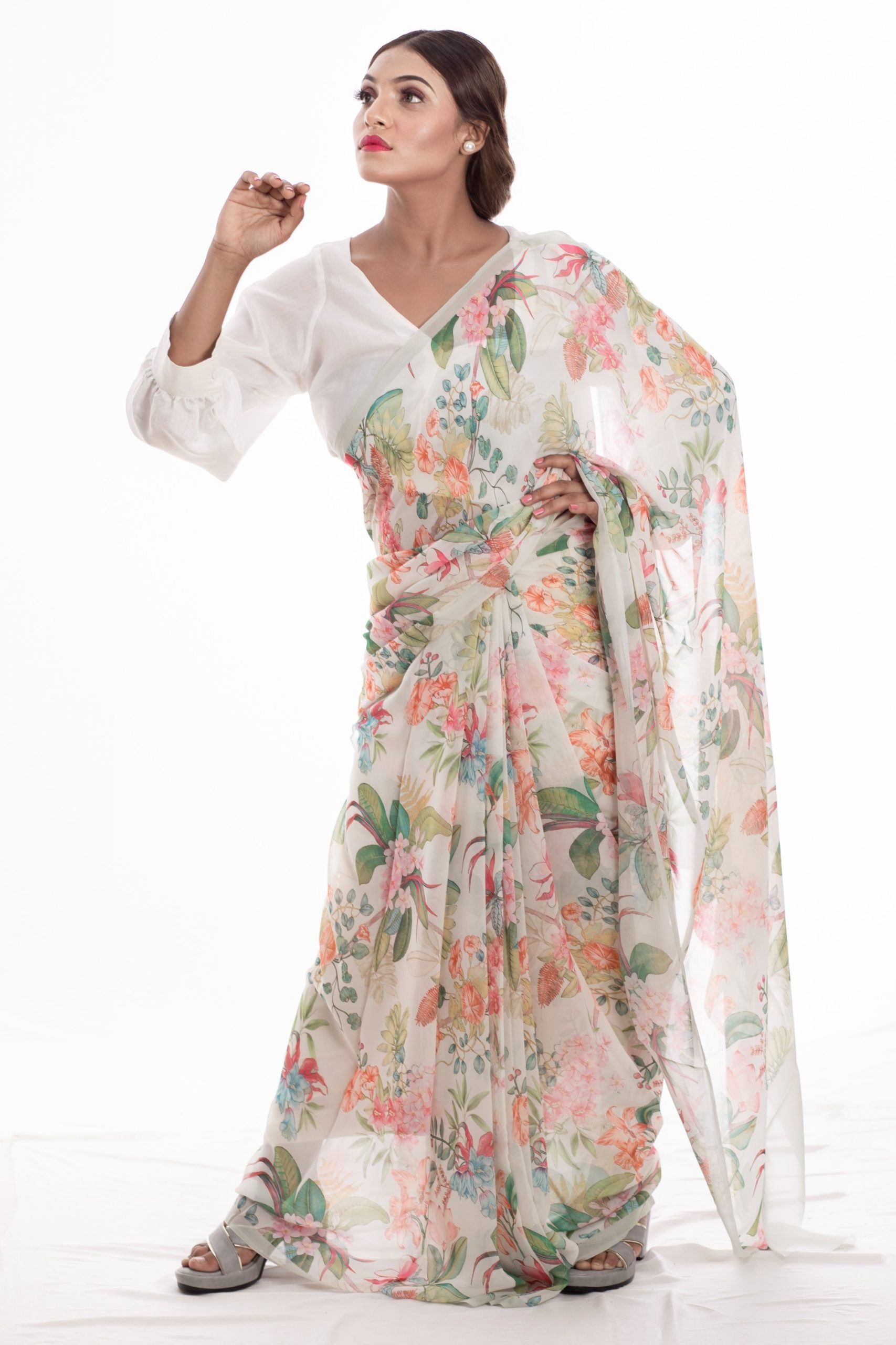 Allover tropical prints on cream base Georgette saree. The tropical prints bring a freshness to the whole saree. The soft, smooth tones of the fabric with elaborate tropical prints, adds to the feminine beauty of the saree.